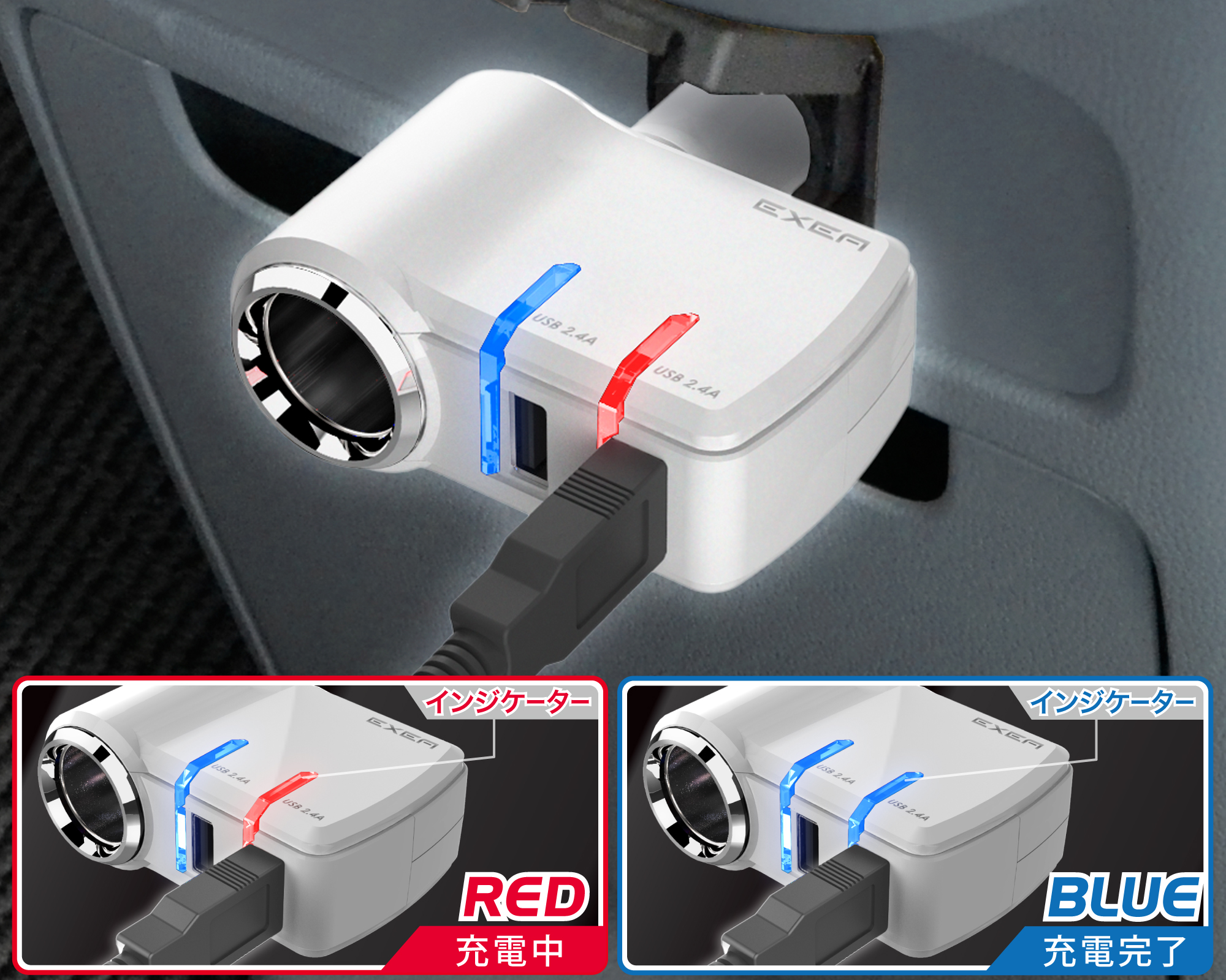 | 充電状態の目安を示すインジケーター付きダイレクトソケット 12Vソケットと5V/2.4A×2ポート(合計4.8A)のUSBを搭載 充電中は[赤色]・充電完了時は[青色]にインジケーターが変化 |
