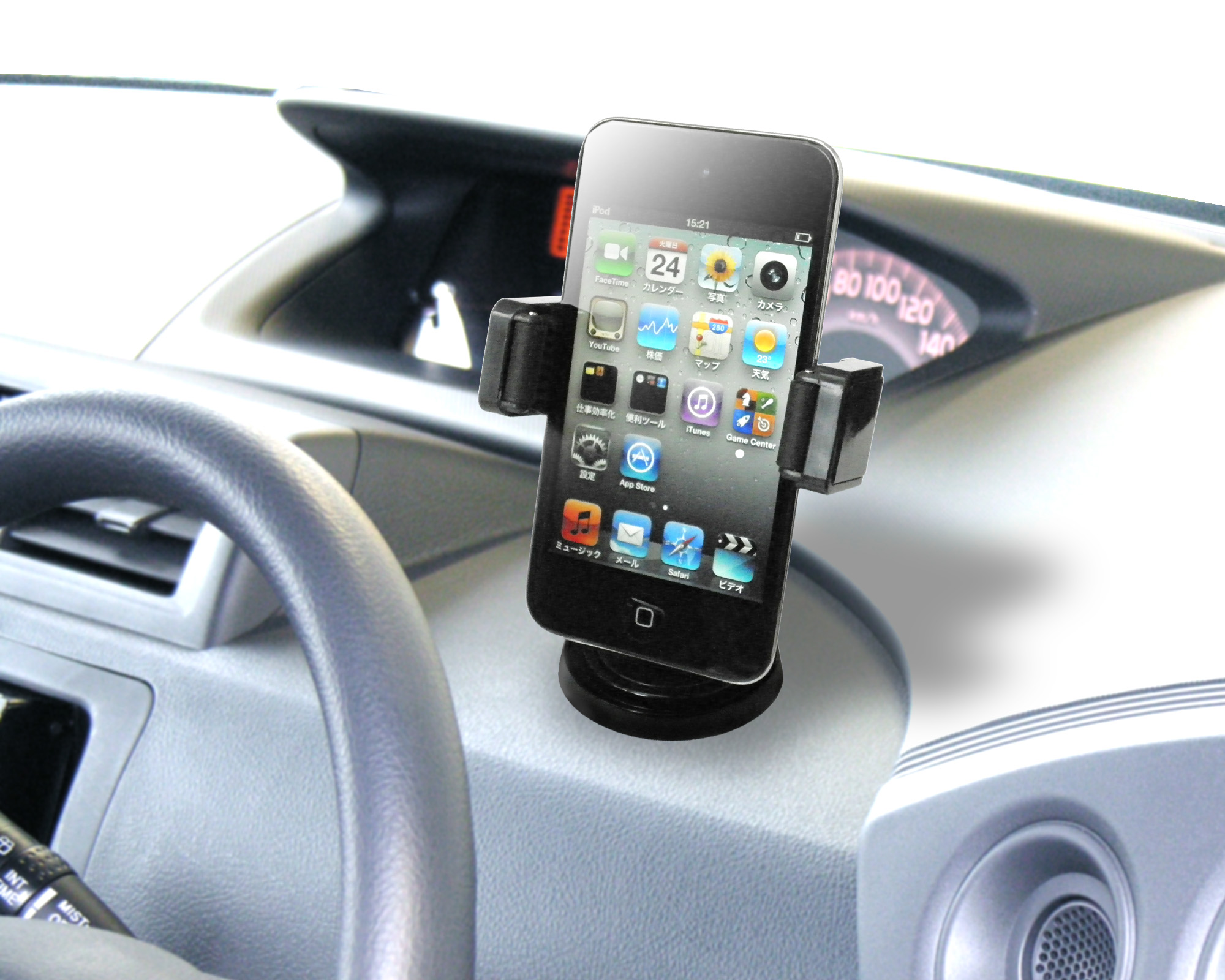 | iPod nanoからスマートフォンを収納し3D調整できるホルダー 正面と左右が360°回転して前後に180°の調整ができる 回転ローラーで着脱がスムーズ/対応挟み幅35mm~80mm |