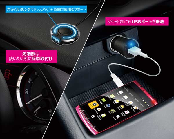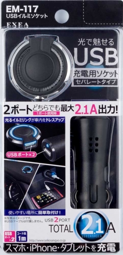 | セパレートタイプの5V/2.1A充電用USBソケット 使いたい場所に簡単取付け、イルミリングが車内をムーディに演出 2つのUSBポートはどちらも最大2.1A出力可能(1ポート使用時) |