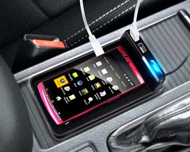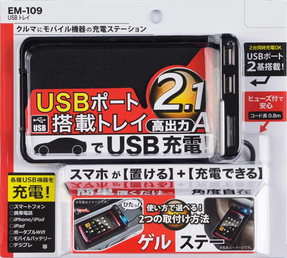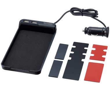 | 充電ステーションとして使用出来るUSBポート搭載トレイ 5V2.1Aで、iPad・スマートフォン等の機器に対応 ゲル取付け&ステー取付けの2通りが可能 |