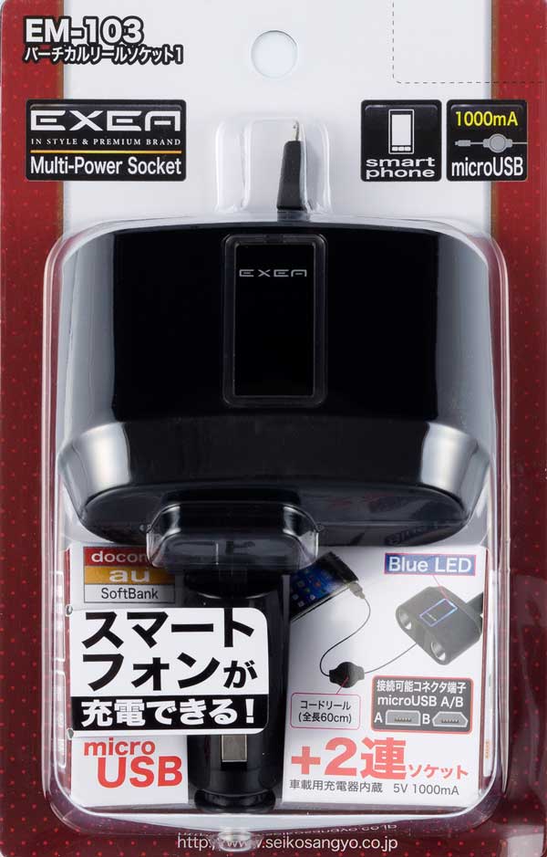 | オープンプライス ■製品サイズ:(リール部分含まず)H37 x W88 x D130 ■パッケージ:H180 x W115 x D60 130g ■小箱サイズ:H195 x W485 x D250 20個入 ■外箱サイズ:H415 x W500 x D265 40個入 ■定格:電圧/DC12V 電流/6A以下(microUSBを含む) microUSB出力/DC5V 1000mA 10Aヒューズ(プラグ内蔵) リールコード全長/0.6m ■JAN:4974267051036 |