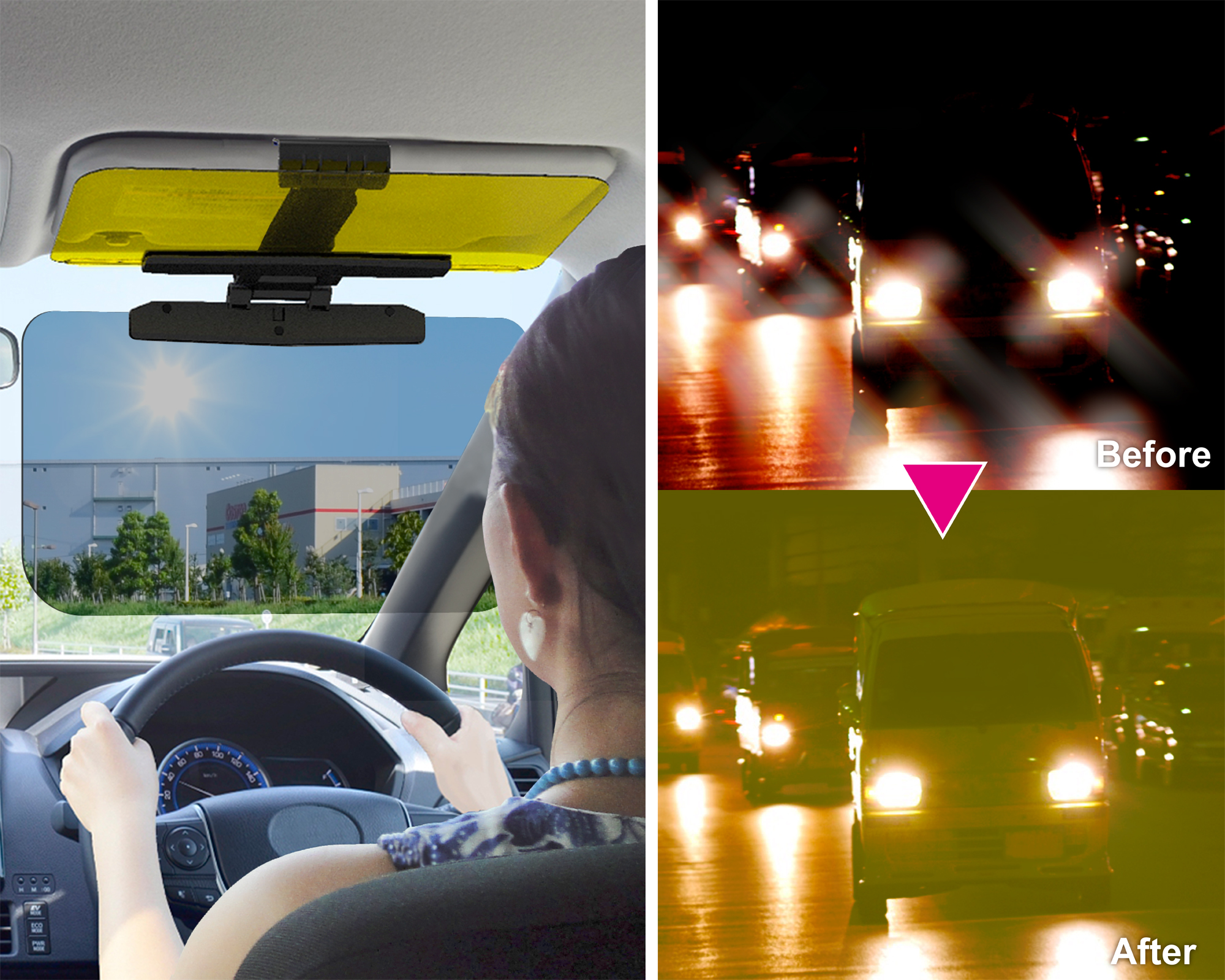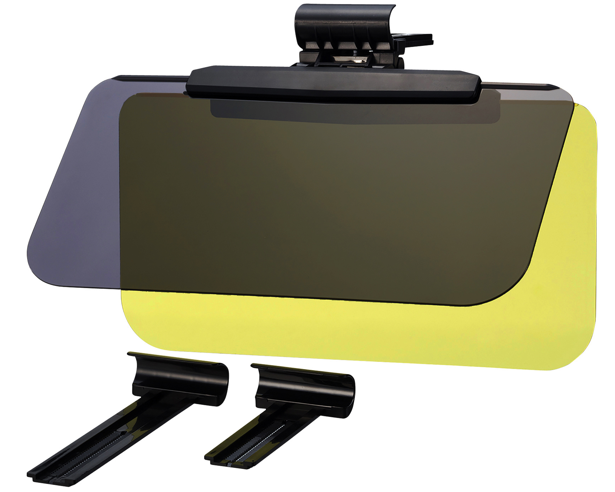 | 昼の陽射し・夜のライト光を2枚の大型バイザーでカット 純正大型バイザー(奥行幅140~255mm)にも取付け可能 前後60mm/左右90mmスライド(純正バイザーミラー対応) |