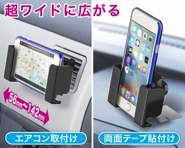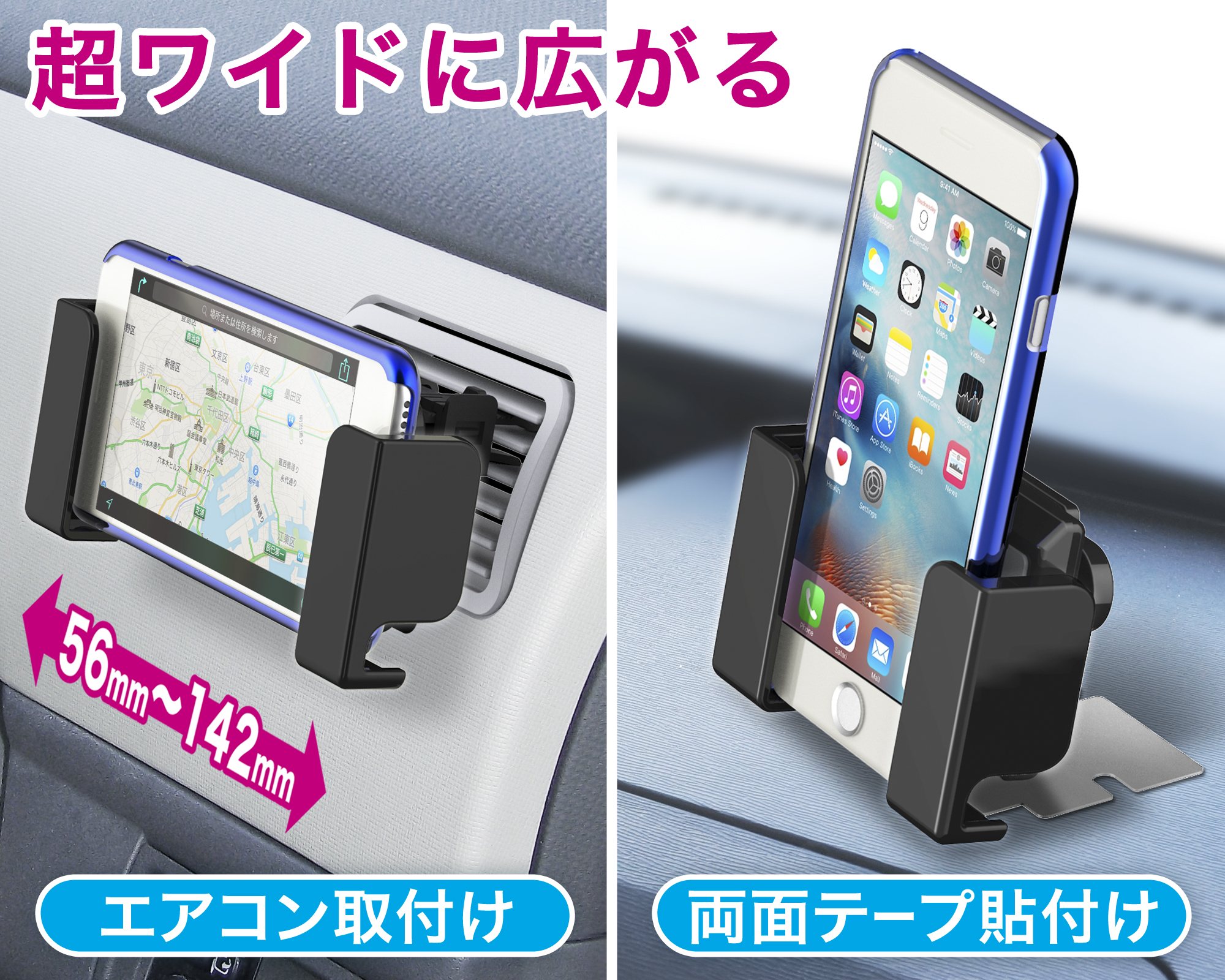 | エアコン取付け式のスマホを簡単に抜き差しできるホルダー 超ワイドに広がるアームでスマホを縦・横お好みの向きで使用可能 貼付けプレート付属で、好きな場所に貼付けて使用する事も可能 |