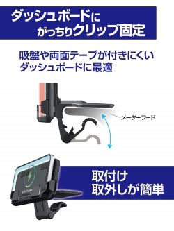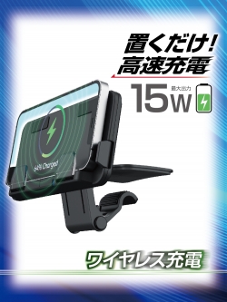 | ●メーターフードに挟んで使用する取付け・取外しが簡単なクリップタイプのワイヤレス充電トレイです。 ●横向きにスマホを置く充電トレイで、簡単に収納できて充電もできます。 ●目の前に設置したスマホは視線移動が少なく、画面を確認しやすいのでカ-ナビに最適です。 ●可動トレイは、スマ-トフォンを見やすい角度に無段階で調節(約0°~90°まで)でき、前方視界の 妨げにならない高さに上下スライドで調節(約20mm)できます。 ●左右ステーと落下防止ステーにより、スマートフォンのズレや落下を防止します。 ワイヤレス充電の対応表 |