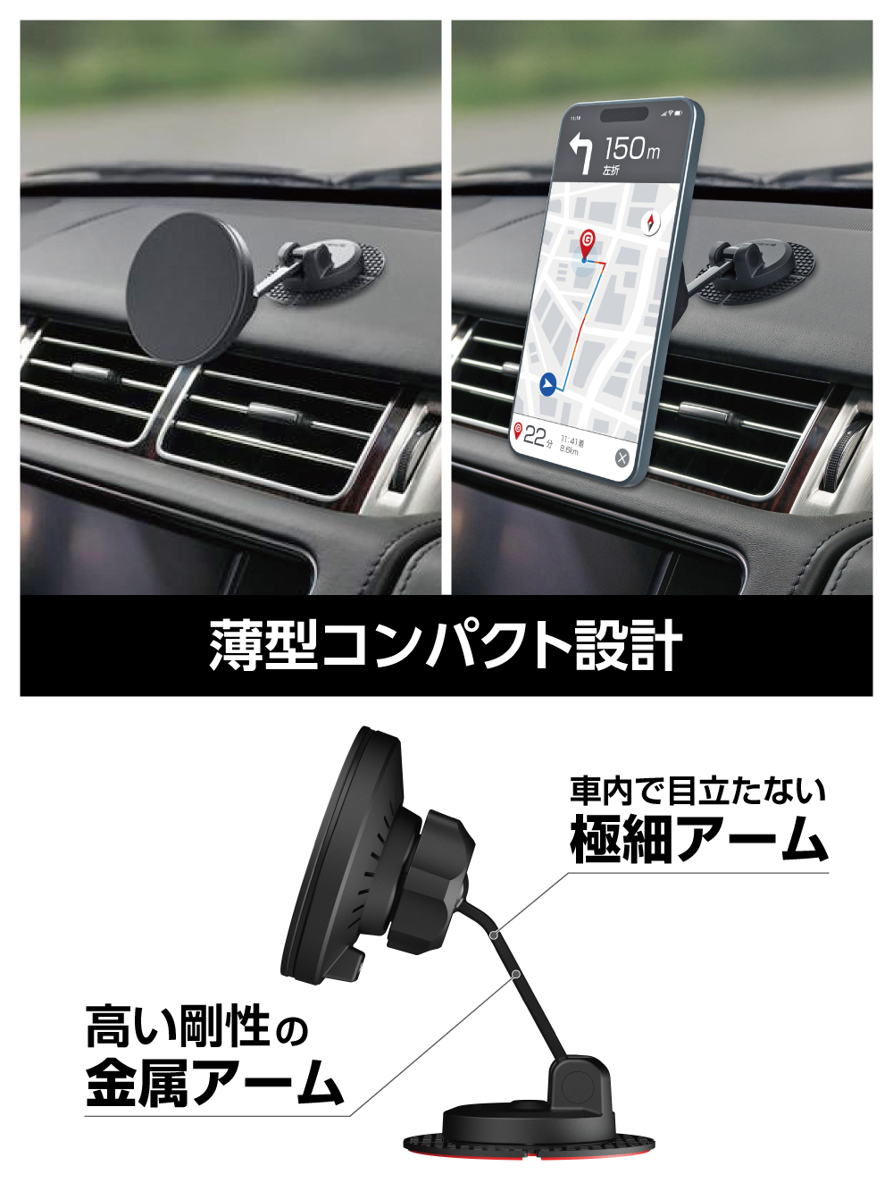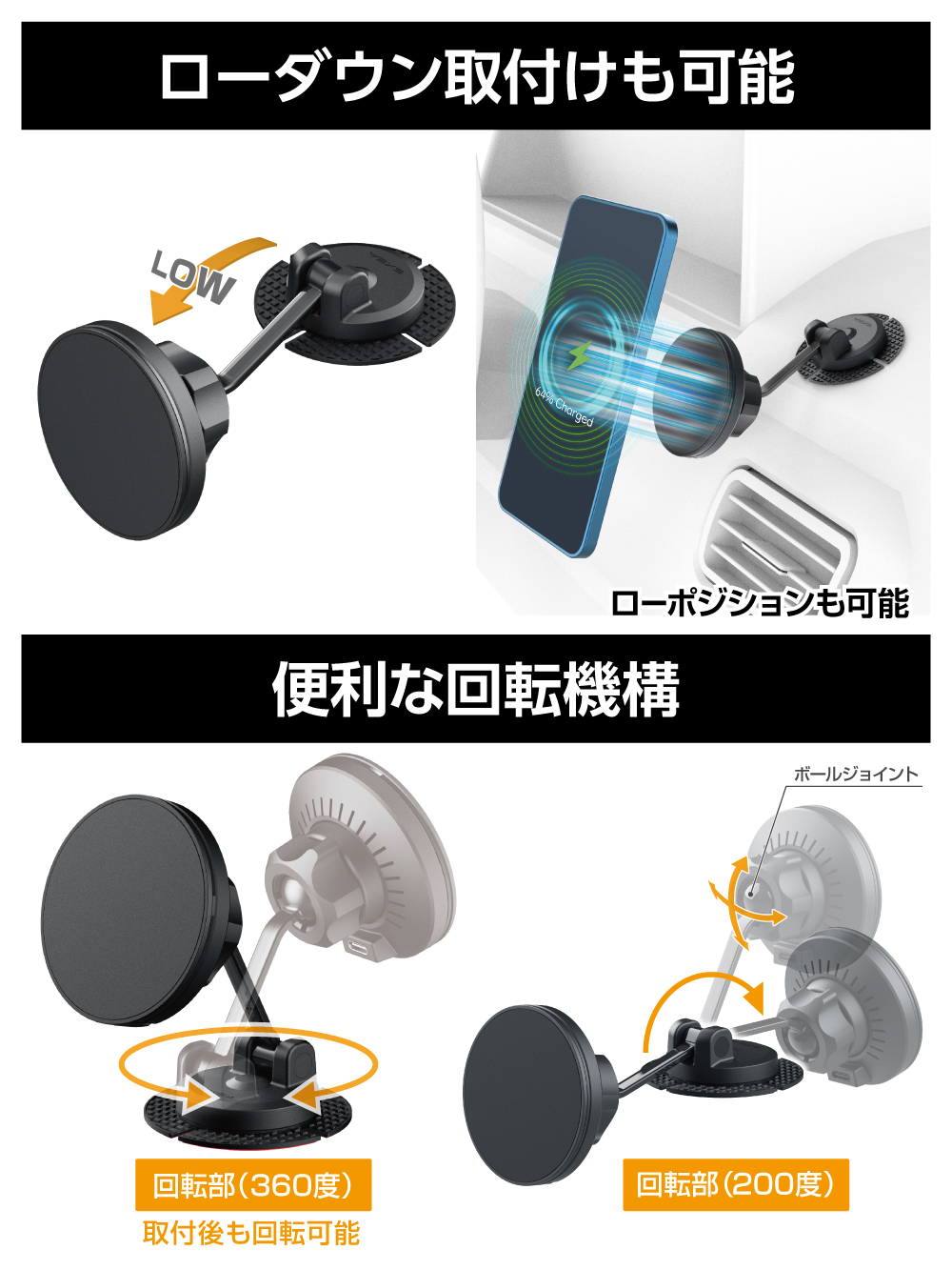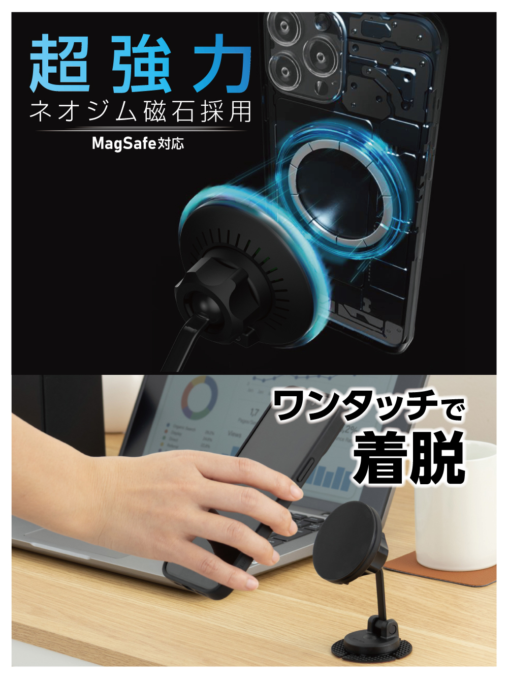 | ・超強力マグネットにより、スマホをワンタッチで着脱できます。 ・ワイヤレス充電対応のスマホを最大出力15Wの高速充電が可能。 ・軟質素材の貼付けベースでダッシュボードなどの曲面にしっかりと取付けられます。 ・剛性が高い金属製アームのスッキリしたデザインです。 ・画面を塞がないので、画面が見やすくタッチ操作も容易です。 ・取付け後も水平方向に360°向きを調整できます。 ・付属の金属リングでMagSafe非対応のスマホに使えます。 ワイヤレス充電の対応表 |