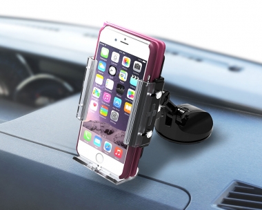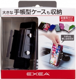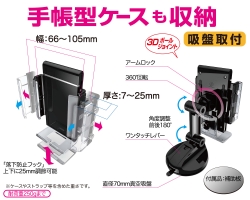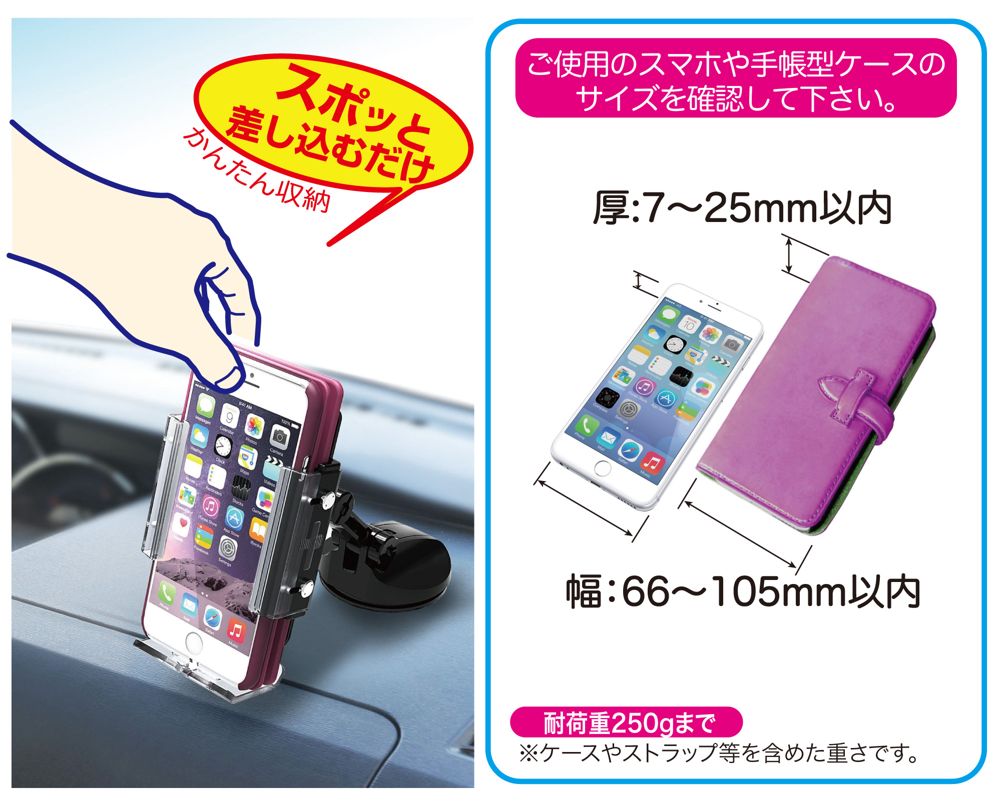 | 大きな手帳型ケースからスリムケースまで収納できるホルダー ホルダー上部から差し込むだけでホールド 取付自在なゲル付き吸盤を採用(補助板が付属) スマホホルダー吸盤の取付け方のコツ |