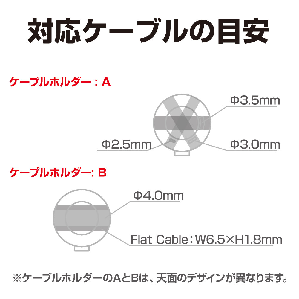 | オープンプライス ■製品サイズ:H23×W59×D5 ■パッケージ:H180×W60×D20 50g ■⼩箱サイズ:H200×W225×D135 20個⼊ ■外箱サイズ:H230×W465×D285 80個⼊ ■収納サイズ:ケーブルの太さ【A:Φ2.5、Φ3.0、Φ3.5】 【B:Φ4.0、フラットケーブルH1.8×W6.5】 ■JAN:4974267132049 |
