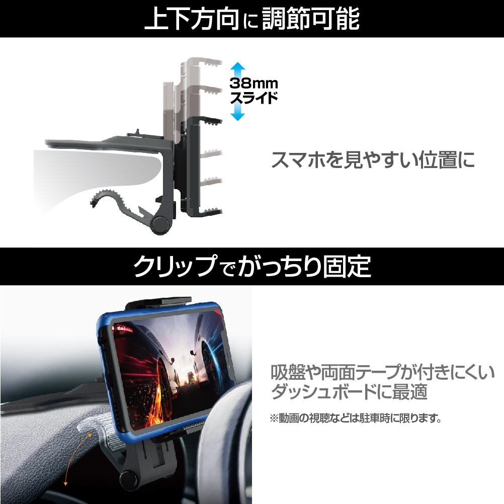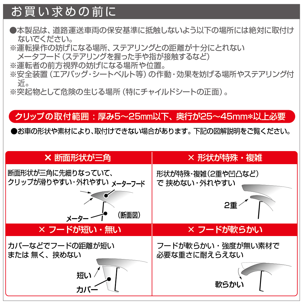| ●メーターフードに取付けて気軽に使えるスマホホルダー ●目線移動が少ないので確認楽々。ナビなどに便利 ●クッション付きでメーターフードに傷跡を残しにくい ●ホルダー部を上下に調節することができ、前方の視界を確保できる ●幅広い車種に対応するのでシェアカー/レンタカーにもおすすめ ●スマホ収納幅55~100mm、厚み16mmまでのスマホに対応 |