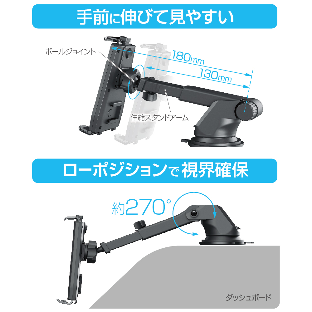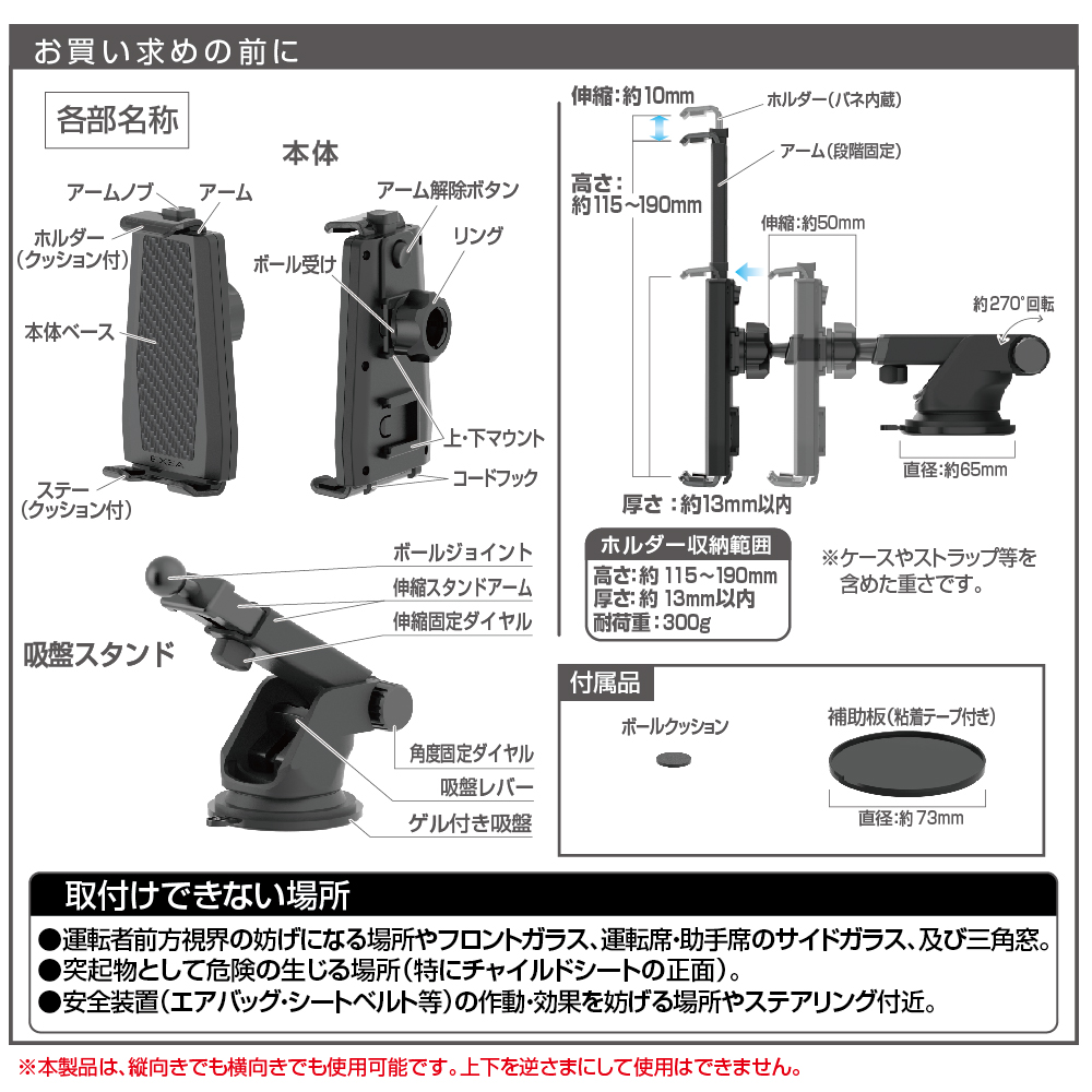 | ●スマホを上下で挟み込んでホールドするスマホホルダーです。 ●ダッシュボード等にしっかり取付けできる吸着ゲル付きの【吸盤取付けタイプ】です。吸盤が付きにくい場所用に補助板が付属。 ●スマホをホールドしたままでも、スマホのサイドボタンの操作ができるので便利です。 ●アームがスマホのサイドボタンを押してしまうことがないので、スマホが誤動作しません。 ●左右にアームがないので、スワイプやタップなどのスマホ操作時に指が接触せず、画面操作がしやすいです。 ●ボールジョイントを搭載しているので、角度調整ができ、横向きでも使用可能です。 |