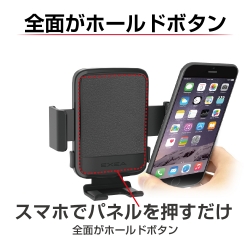 | ●片手でスマートフォンを着脱できるスマホホルダーです。 ●スイングアーム搭載で、エアコン風を妨げない位置にアーム調整が可能です。 ●スマートフォンを押し当てるだけでホールドできるオートキャッチ機能搭載。 ●車内に馴染む本革調デザインの全面解除パネル採用で上質感あるデザイン。 ●左右のアームOPENボタンは押した分だけアームが開くフリーストップ機構。 |