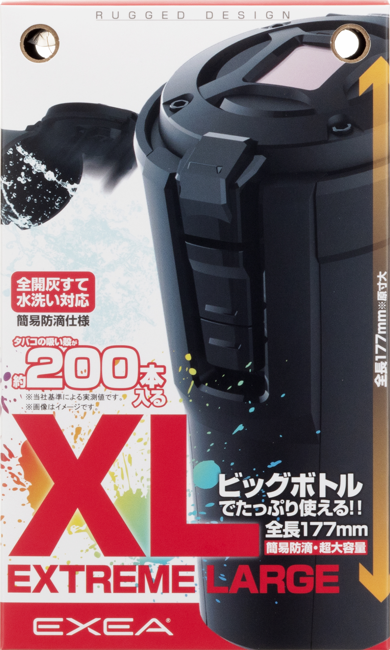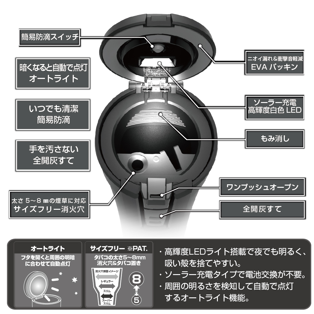| ●ワイド開口ビッグボディで約200本の吸い殻を捨てられるXLサイズの灰皿です。 ●「全開灰すて」機能でフタが消火部ごと大きく開き、吸い殻が捨てやすい設計です。 ※誤作動防止のロック機能が付いています。 ●溜まった吸い殻が引っかからず捨てることが出来ます。 ●簡易防滴設計になっていますので、汚れた灰皿を注水で濯ぎ洗いをすることが出来ます。 ●スーパースリム~レギュラーサイズのタバコ対応の消火穴とタバコ置を備えています。 ●ソーラー+オートライト(白LED)で周囲の明暗に合わせて自動点灯します。 |