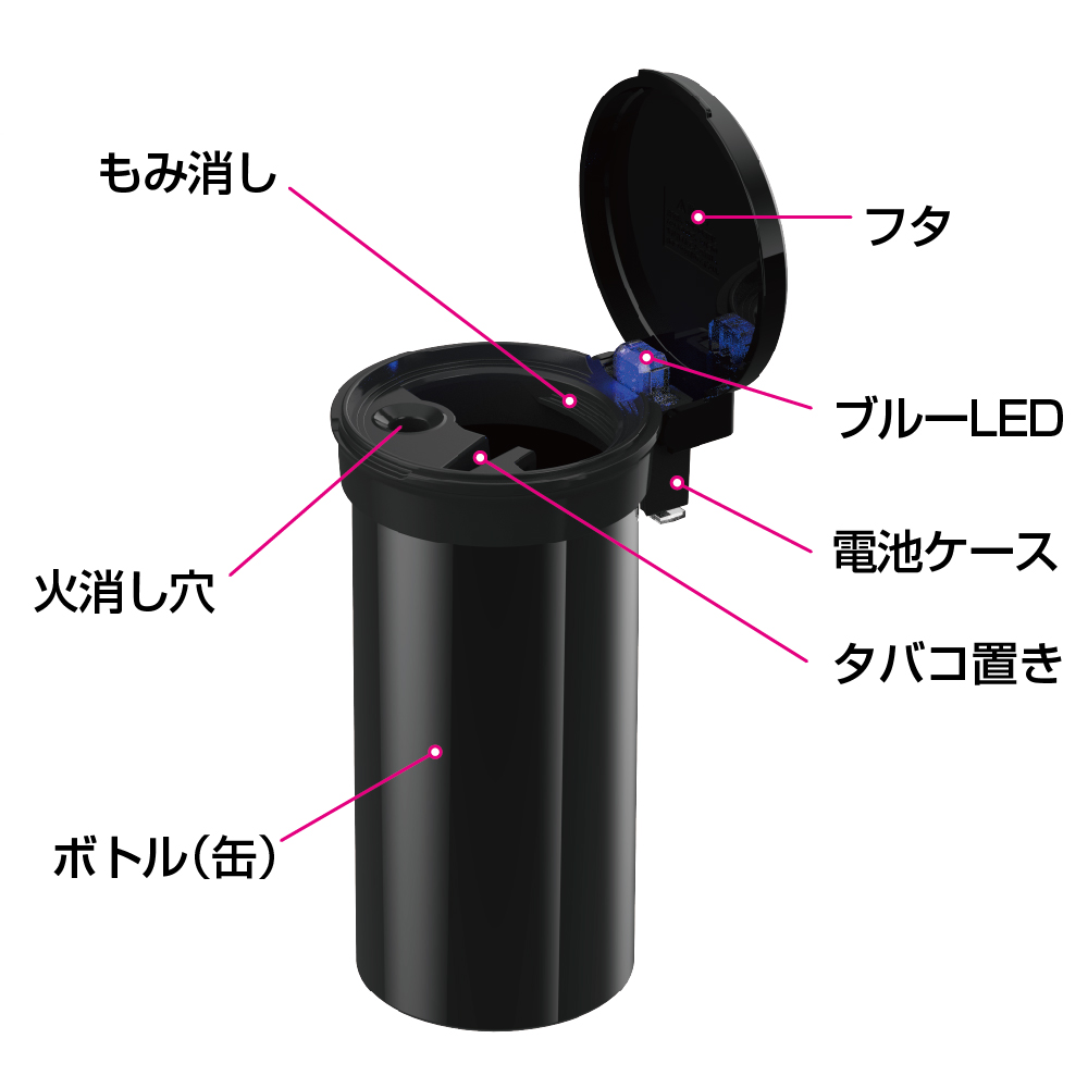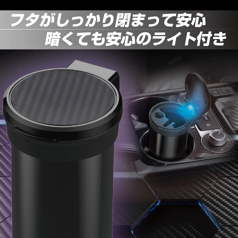 | ●カーボンテクスチャのスポーティな缶タイプ灰皿です。 ●夜間などの暗い場所で便利なブルーLED照明付き。 (電池式:CR2032…1個使用) ●ロング缶で大容量、約120本収納できます。 (弊社基準による実測値です。) ●便利な火消し穴とタバコ置き付きです。 |