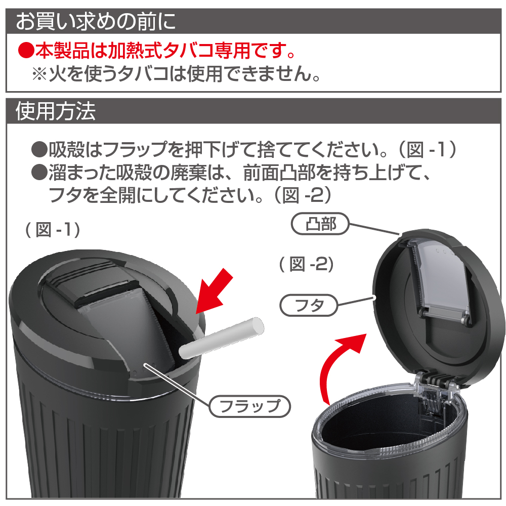 | ●加熱式タバコ専用の大容量の吸殻入れです。 ●フタの開け方は、吸殻を入れやすいプッシュ式「フラップ」と、 溜まった吸殻を廃棄しやすい全開「フタ」の2ウェイオープン構造です。 ●溜まった吸殻を確認できるよう、フラップにはスモークカラーを採用 しています。 ●カタカタしない軟質のソフトボトルなので収納場所にも困りません。 ●シンプルな構造なので水洗いもOKです。 |
