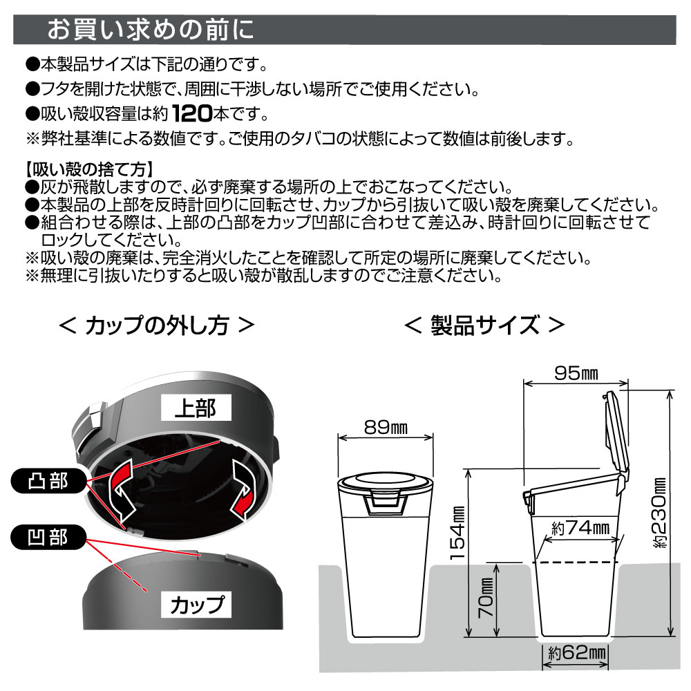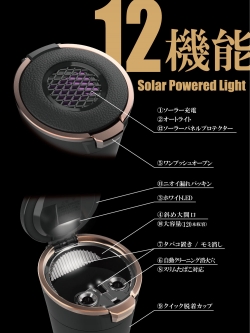 | ・車内での使いやすさにこだわったソーラーライト付き多機能灰皿です。 ・「灰づまり自動クリーニング消火穴」をはじめ、車載用灰皿に特化した12の機能を備えています。 ※詳しくはパッケージ側面をご参照ください。 ・ドリンクホルダーに収まりの良いテーパードデザインです。 Amazonでご購入はこちら |