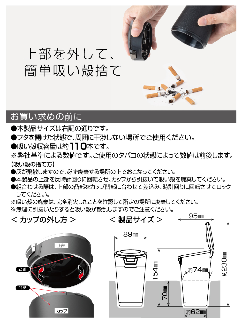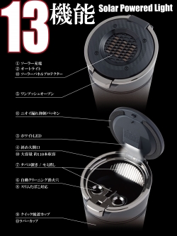 | ・車内での使いやすさにこだわったソーラーライト付き多機能灰皿です。 ・「灰づまり自動クリーニング消火穴」をはじめ、車載用灰皿に特化した13の機能を備えています。 ・振動音を抑えるラバー製カップで、走行中でも快適な車内空間を保ちます。 ・カーボンリング&ブラックメッキをあしらったデザインです。 |