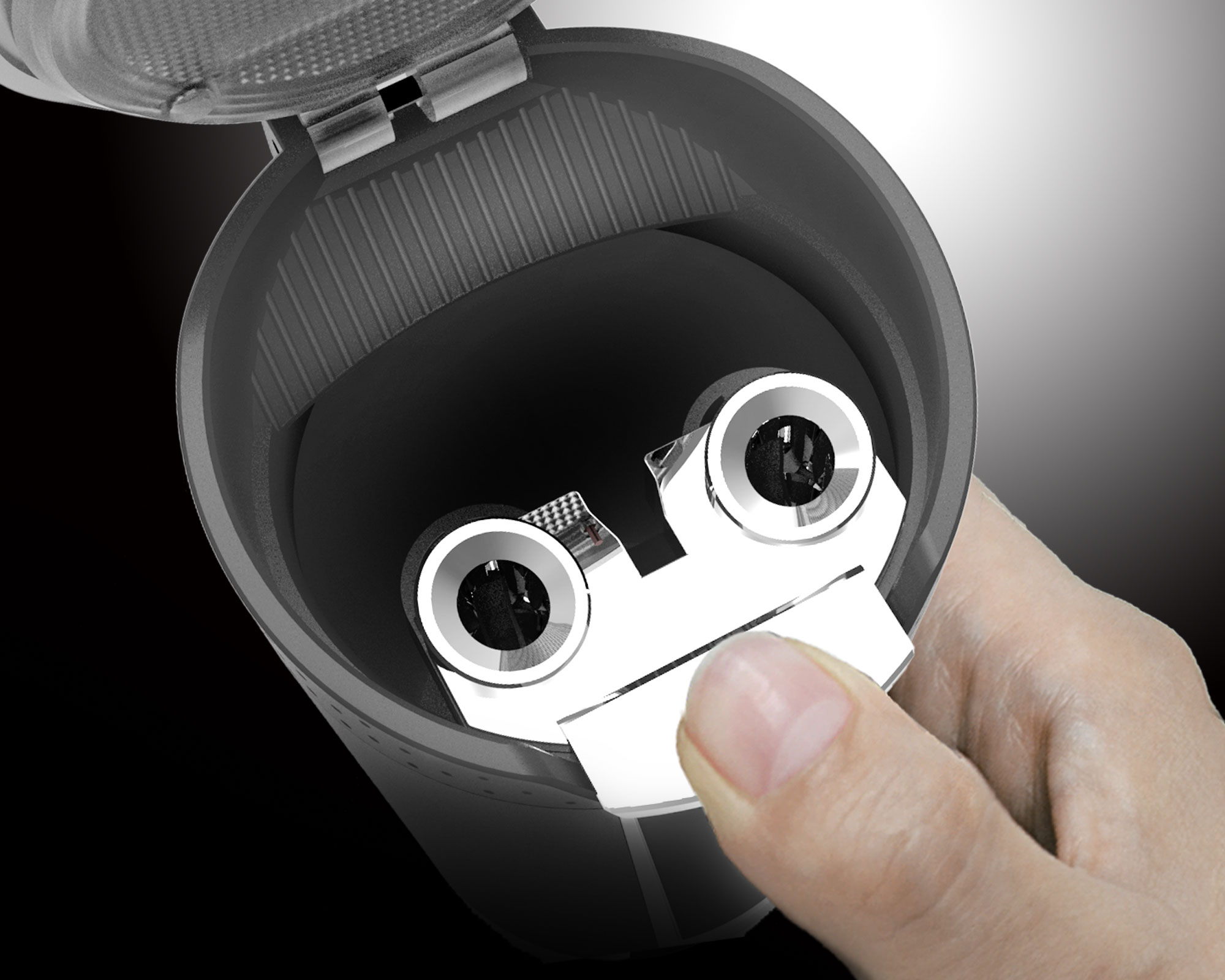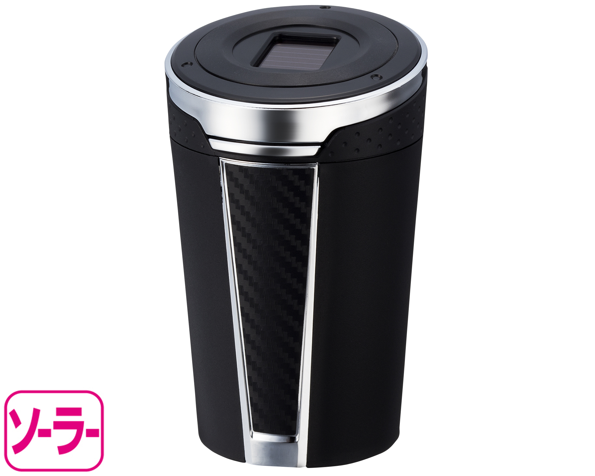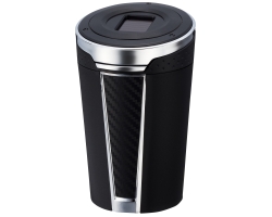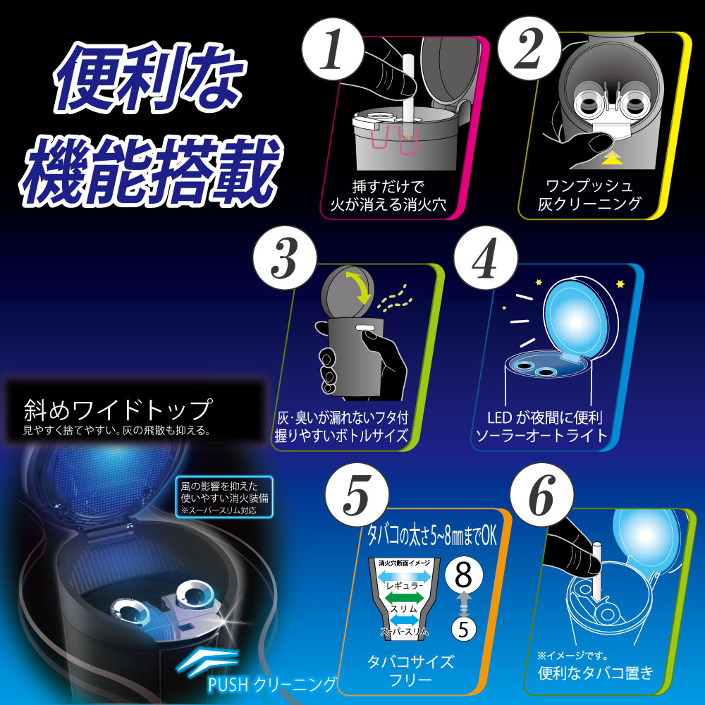 | 斜めワイドトップが使いやすいカーボン調デザイン灰皿 フタはワンプッシュオープンで消火穴クリーニング機能付き スーパースリムの太さまで(5~8mm)対応の消火穴とタバコ置き |