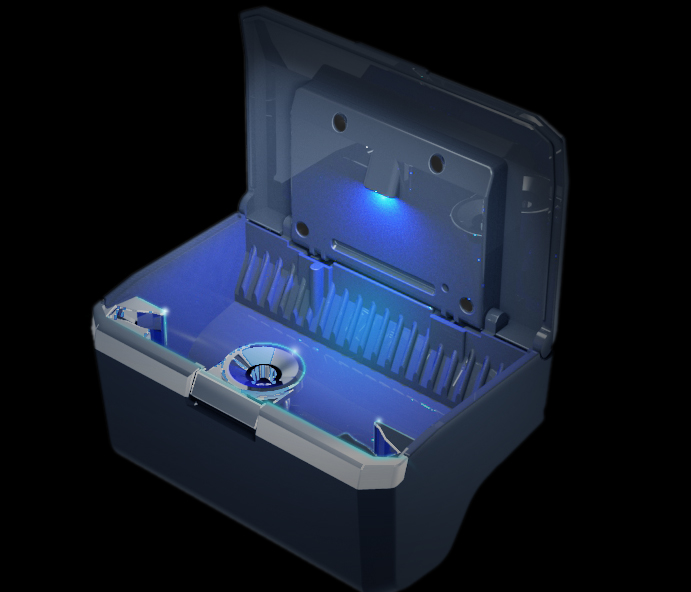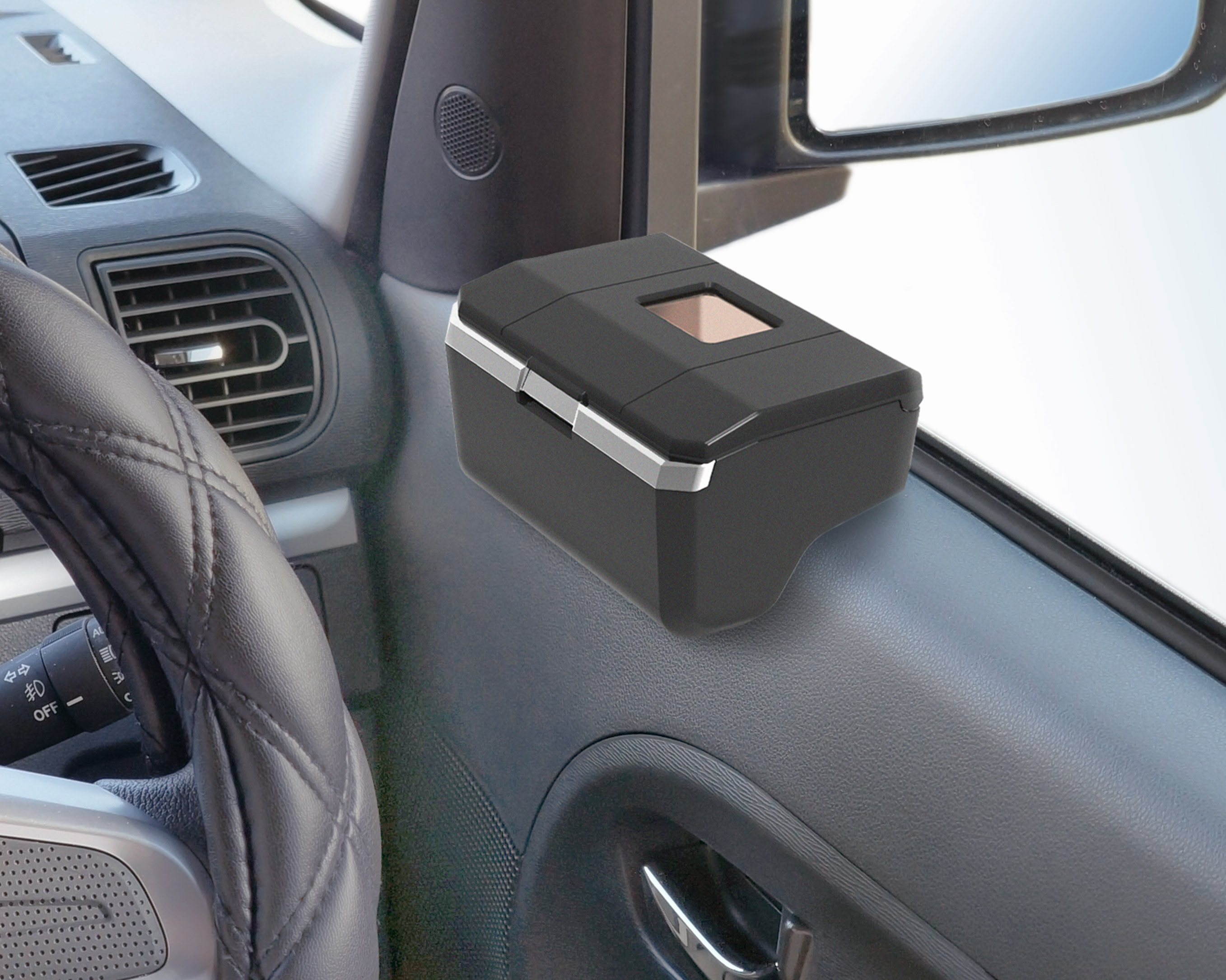 | ドアなどの縁に取付け、レバーやスイッチなどに干渉しにくい灰皿 暗くなるとブルーLEDが自動点灯するオートライト機能付き スーパースリムの太さまで(5~8mm)対応の消火穴とタバコ置き |