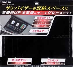 | 収納スペースをプラスする便利なサンバイザー取付けポケット 高級感がある本革調レザー+グレーステッチ 奥行幅270mmまでの大型サンバイザー対応、面ファスナーで固定 |