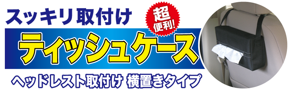 | ヘッドレスト取付け横置きタイプのティッシュケース ティッシュBOXは面ファスナー固定なので交換もらくらく コンビニ袋を取付けてゴミ箱として利用できる |