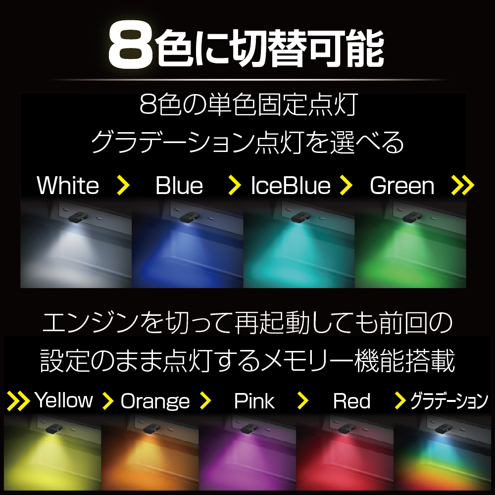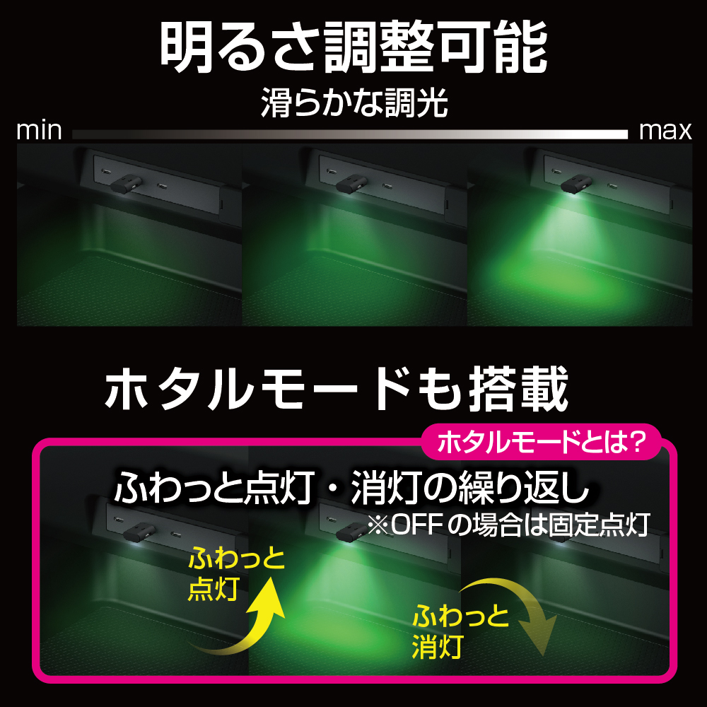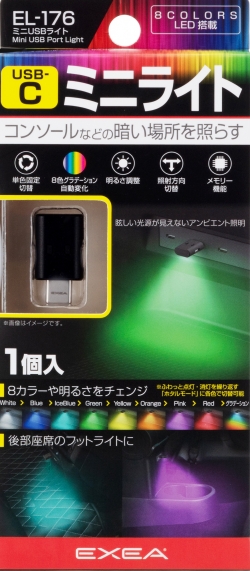 | ●8色の単色固定点灯やグラデーション点灯を選べるUSB-Cポート用のLEDライトです。 ●コンソールBOXやセンターコンソールなどの暗い場所を照らすのに最適です。 ●コンソールBOX内でも邪魔にならないミニサイズです。 ●明るさの調整やホタルモード*(蛍のような光り方)への切替ができます。*下記参照 ●点灯LEDを切替えると照射方向を変更できるので、車種や機器によって 異なるUSB-Cポートの向き(横・縦)に対応できます。 ●エンジンやモーターを切って再始動しても前回の設定のまま点灯するメモリー機能を搭載。 ●USB-Cプラグなので取付け場所に合わせてどちらの向きでも差し込めます。 |